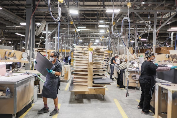 Employees sand pieces of custom cabinetry at the Cabico&co and Elmwood Cabinetry factory in St. Catharines, Ont.Nick Iwanyshyn/The Globe and Mail