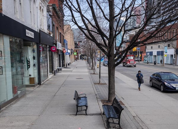 A normally bustling Queen Street West is lined with closed stores and empty of shoppers, on March 25, 2020. Small and medium-sized businesses have been among the hardest hit by the novel coronavirus crisis since being forced to shut their doors nearly six weeks ago.Melissa Tait/The Globe and Mail