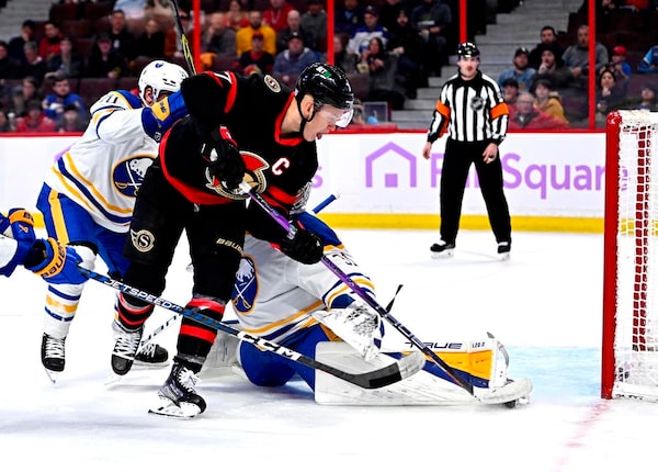 Ottawa Senators left wing Brady Tkachuk watches as his shot on Buffalo Sabres goaltender Eric Comrie crosses the goal line and into the net.The Canadian Press