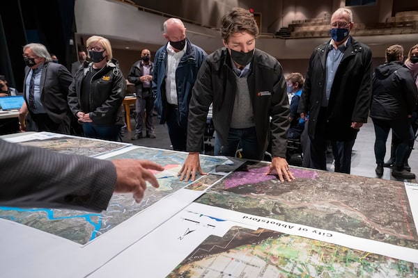 Prime Minister Justin Trudeau looks at maps of Abbotsford, B.C., on a November visit to the flooded city. An 'atmospheric river' brought record-breaking rainfall to the B.C. Interior and Lower Mainland, heightening alarm about the extreme weather that climate change will bring to Canada.Jonathan Hayward/The Canadian Press