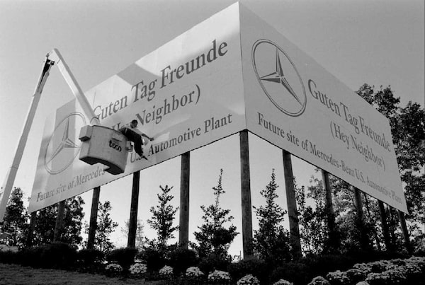 Workers install a sign near near Tuscaloosa, Ala., announcing a future North American Mercedes-Benz plant, in September, 1993. The German auto maker’s investment in the state kickstarted a wave of companies looking to build their production facilities in Alabama.John C. Hillery/REUTERS