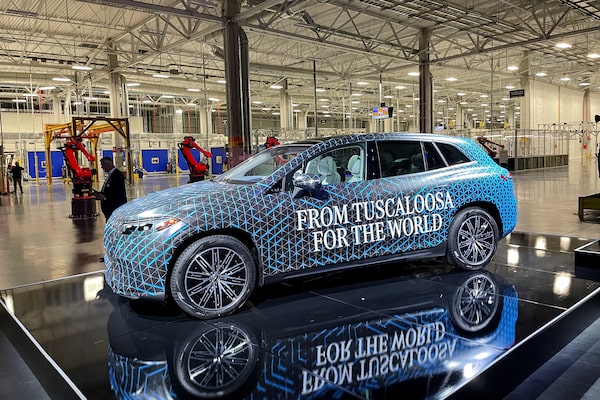 A prototype of a Mercedes-Benz Electric SUV is displayed at the automaker’s battery pack plant in Bibb County, Ala., in March, 2022.Reuters