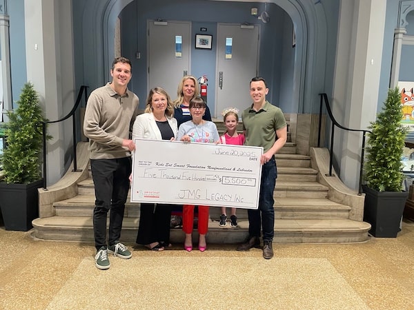 From left, Chris Goodridge, co‑founder of JMG Legacy; Jennifer Yetman, director of communications at Kids Eat Smart Foundation N.L.; Krista Goulding, vice-principal of Bishop Feild Elementary; Norma Aylward, principal of Bishop Feild Elementary; Lauren Goodridge, James Goodridge's daughter; and James Goodridge at Bishop Feild Elementary on June 20, 2025.Courtesy of James Goodridge/Supplied