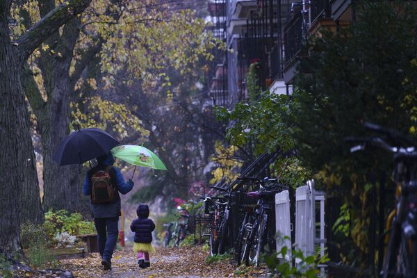 A man walks his daughter to daycare on a rainy morning in Montreal on Oct. 26, 2020.Paul Chiasson/The Canadian Press