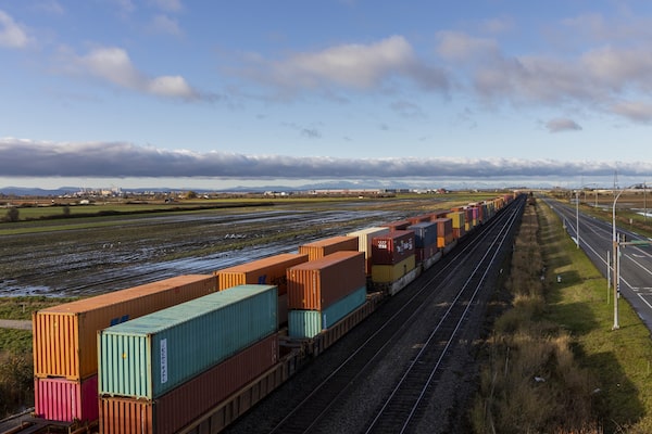 Rows of idle trains sit loaded with stacks of shipping containers on the tracks near Global Container Terminal’s Deltaport, waiting for the reopening of the Vancouver rail system after it was temporarily halted following damage caused by flooding and mud slides.Alia Youssef/The Globe and Mail