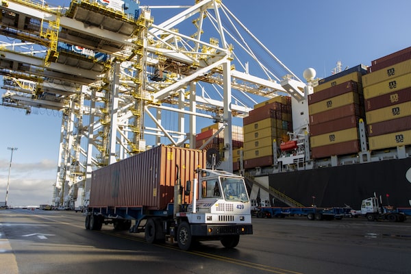 “It’s all connected,” Mr. Dekovic said, as a ship-to-shore crane placed one container after another onto a steady stream of “bomb carts” – the rugged trucks that go “bombing around” to shuttle the reusable steel boxes within the sprawling terminal.