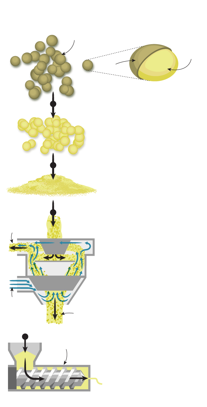 Pulses – lentils, chickpeas, peas and dry beans – are the edible seeds of legume plants and contain three main parts: fiber, starch and – the key component – protein. Through a process called fractionation, protein can be squeezed out of pulses. There are two major types of fractionation: dry, also called air classification, and wet. Below is a simple illustration of the air classification process.
