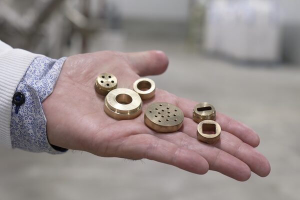 Mr. Al-Katib holds a variety of dies that can be used with AGT’s extruder. The extruder was built in 2022 and finished in early 2023.Michael Bell/The Globe and Mail