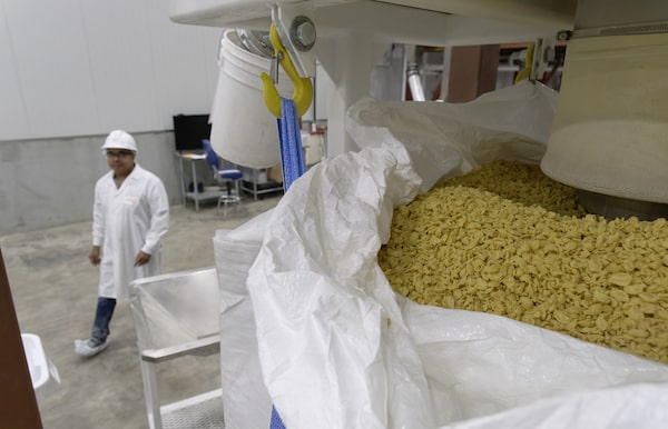 An extruder pushes yellow pea dough through dies (the gold coloured discs). The dies can be changed to create different shapes.Michael Bell/The Globe and Mail