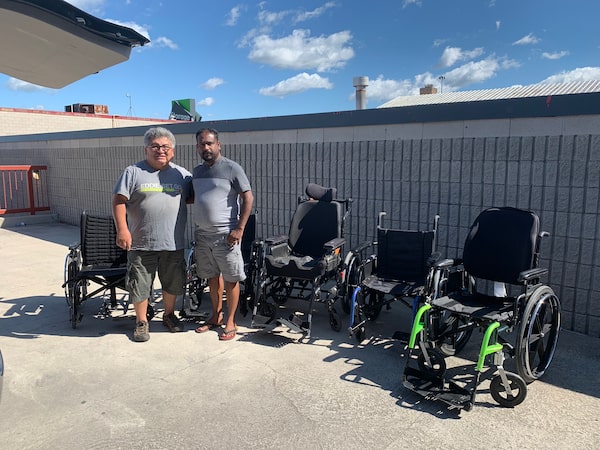 José Orozco, left, and Ajantham Vettivelu pictured in 2019 with wheelchairs to send abroad.Supplied