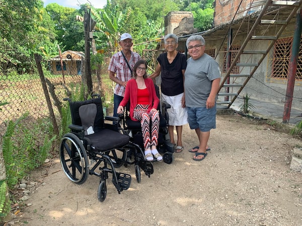 From left: Sebastian Tamayo, Niurvis Caballero, Juana Guerra, and Mr. Orozco in 2023 in Cuba. Ms. Caballero received power and manual wheelchairs to help her travel to school.Supplied