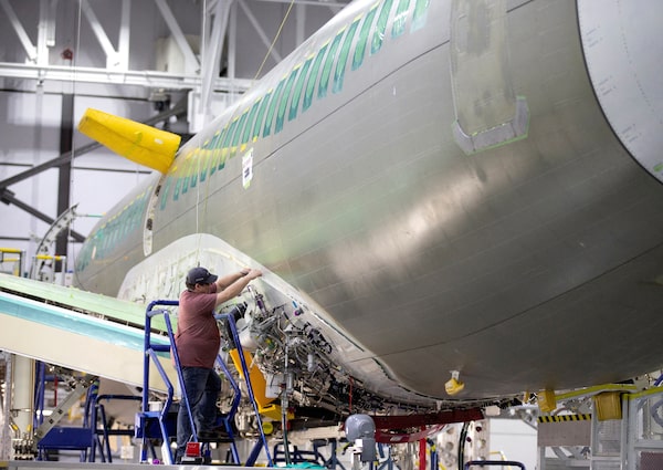 An employee works on an Airbus A220-300 at the Airbus facility in Mirabel, Que., in February, 2020. Airbus employs 3,500 people in Mirabel at an average salary of $87,500 a year.Christinne Muschi/Reuters