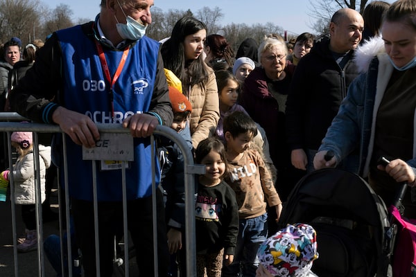 Refugees from Ukraine wait in line for identification documents outside the National Stadium in Warsaw, Poland, on March 21.Maciek Nabrdalik/The New York Times News Service