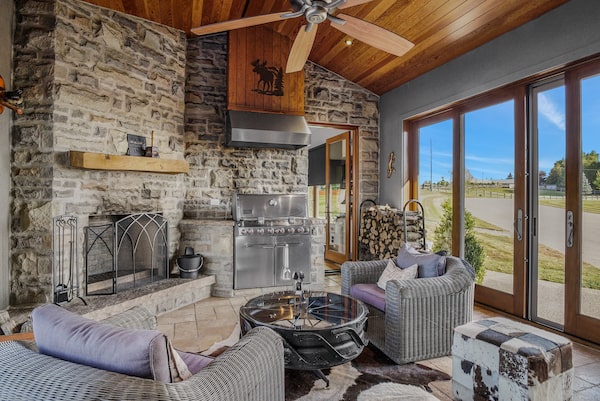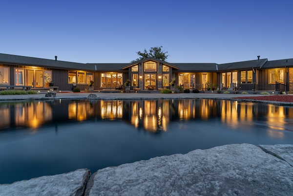The four-bedroom, eight-bathroom home just 20 minutes outside Kitchener-Waterloo sits on a 122-acre plot of land — something the current owners have taken advantage of. The land surrounding the home was used for snowmobile racing in the winter, and motocross in the summers. Once you tire yourself out and finally go inside, the home is designed with both Muskoka cottage life and West Coast sensibilities in mind. The front foyer sits at the middle of the home’s central mass with four small wings extending in an almost X-shape: one for the triple-car garage; one for the family room and barbecue wing; one for laundry and kids’ bedrooms; and one wing for the primary suite.