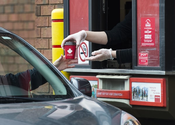 A Tim Hortons employee hands out coffee from a drive-through window to a customer in Mississauga, Ont., on March 17, 2020.Nathan Denette/The Canadian Press