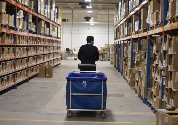 An employee goes down aisles of open stock to fill on-line orders at the new distribution centre for La Vie en Rose in Montreal April 14, 2020.Christinne Muschi/The Globe and Mail