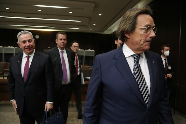 Quebecor Media Inc. President and Chief Executive Pierre Karl Péladeau (R) and Rogers Communications Inc. President and Chief Executive Officer Tony Staffieri (L) leaves after appearing at the Standing Committee on Industry and Technology (INDU) on Parliament Hill January 25, 2023 in Ottawa.Dave Chan/The Globe and Mail
