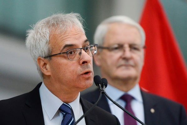 Scott Streiner, chair and CEO of the Canadian Transportation Agency, and Transport Minister Marc Garneau launch the final provisions of the Air Passenger Protection Regulations, at the Ottawa International Airport, in Ottawa, on Dec. 13, 2019.Sean Kilpatrick/The Canadian Press