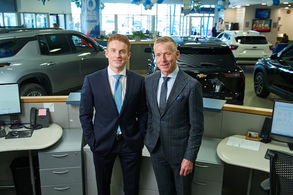 Dan Murray, right, works with his son Grayson at Murray Chevrolet in Winnipeg. Dan and his three brothers are equal partners in the group of about 33 dealerships, with the expectation that each branch of their families will one day have a seat at the ownership table.David Lipnowski