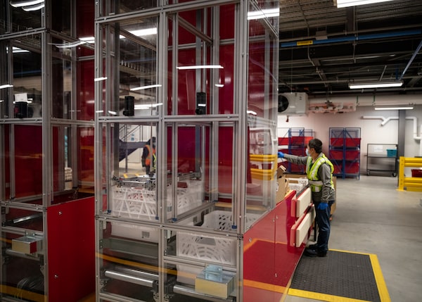 A fleet of boxy robots the size of small dishwashers whiz to and fro along a lattice of metal tracks, pausing frequently to hoist plastic bins full of grocery items from a vast storage grid beneath them. The robots glide from square to square on a surface the size of 43 basketball courts, constantly rearranging the bins. This is the “hive,” and it is the centrepiece of Empire Co. Ltd.‘s $200-million investment in its new e-commerce service, Voilà.
