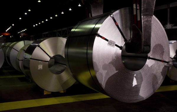 Shadows of workers are reflected on rolls of coated steel at Stelco in Hamilton, Ont., on June 29, 2018.Peter Power/The Canadian Press