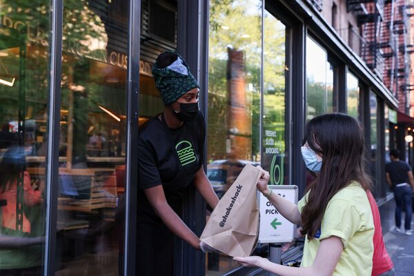 A customer in New York receives an order from Shake Shack, a restaurant chain that's experimented with four-day work weeks.CAITLIN OCHS/Reuters