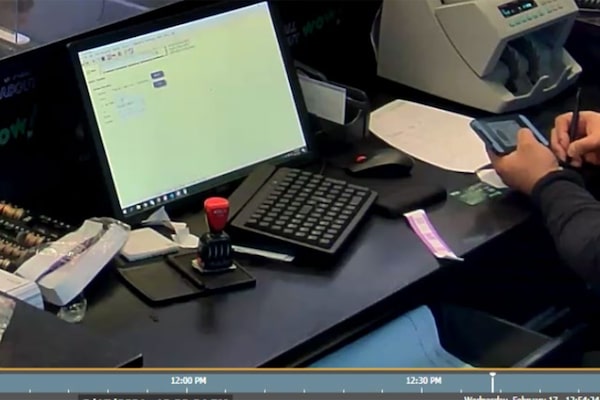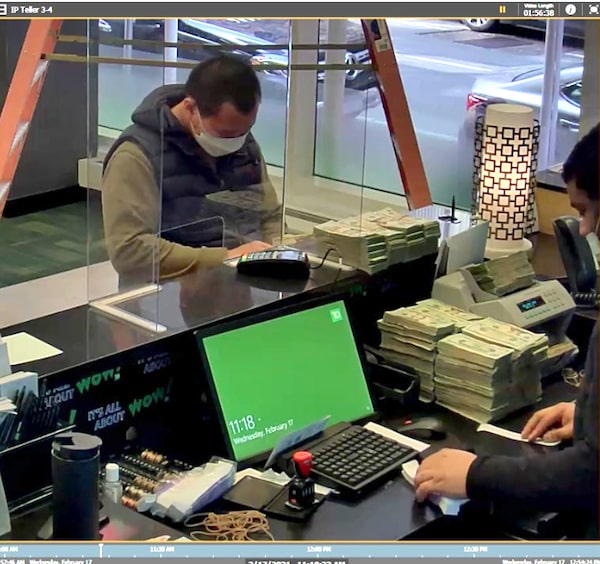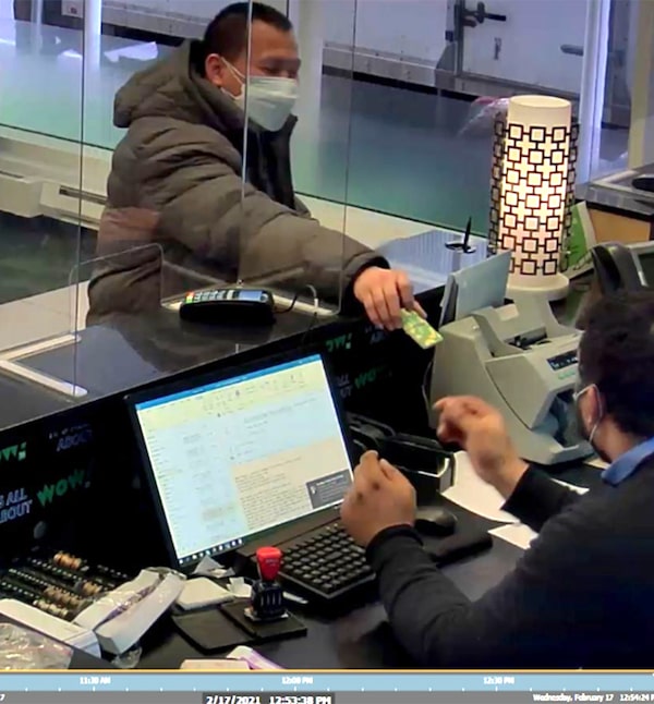 In the court filings, photos from TD surveillance video footage in 2021 show Mr. Aquino processing a large cash transaction for Mr. Sze, who later passes the former bank employee a stack of retail gift cards as compensation.