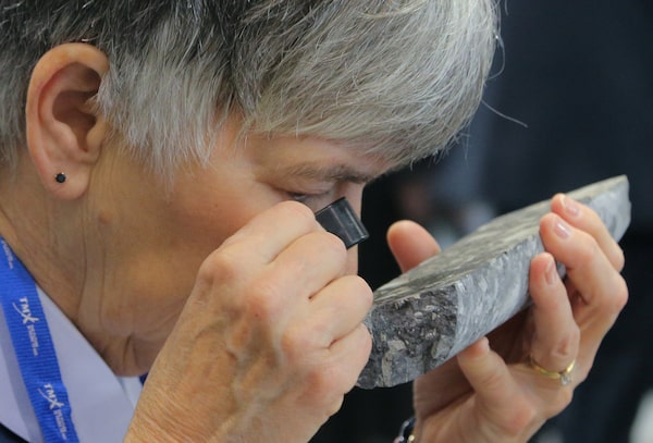A visitor looks at a core sample from Barrick's Fourmile Goldrush Camp at the Prospectors and Developers Association of Canada annual convention in Toronto in 2019.CHRIS HELGREN/Reuters