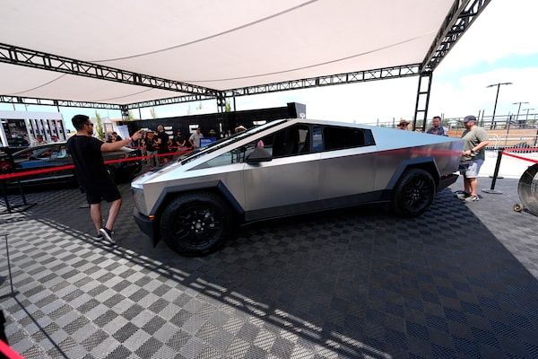 Visitors look over a 2024 Cybertruck in the Tesla display at the Electrify Expo in The Yards Sunday, July 14, 2024, in north Denver.David Zalubowski/The Associated Press