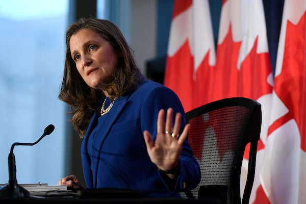 Deputy Prime Minister and Minister of Finance Chrystia Freeland speaks at a news conference ahead of the tabling of the federal budget in Ottawa on April 7.Justin Tang/The Canadian Press