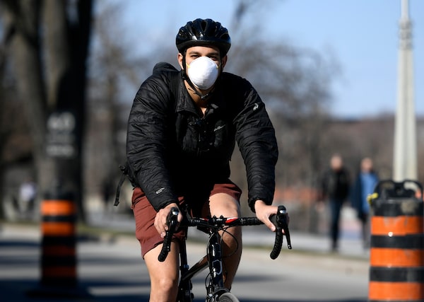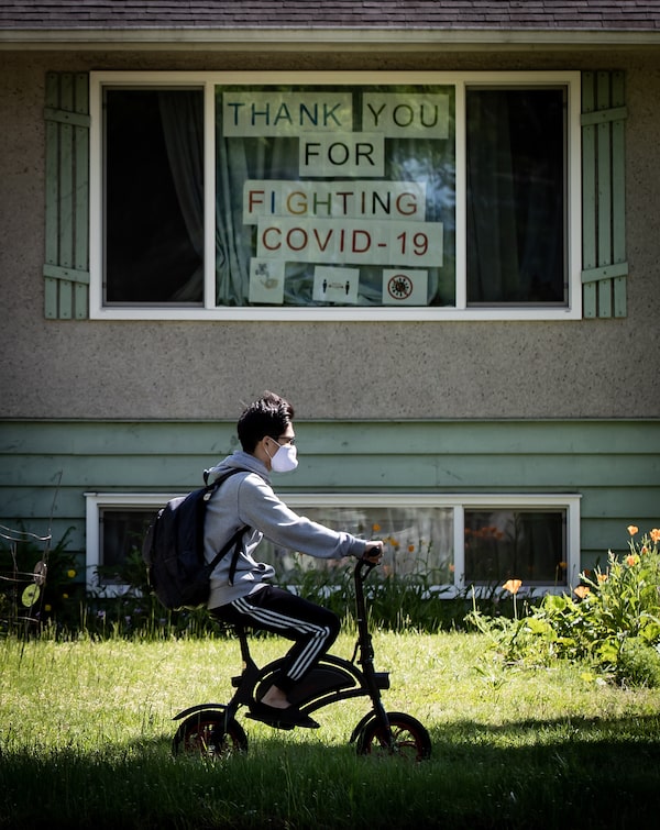 A cyclist rides past a Vancouver house with a 'thank you for fighting COVID-19' sign.Darryl Dyck/The Canadian Press/The Canadian Press