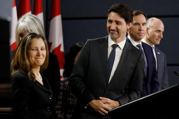 Prime Minister Justin Trudeau looks at his deputy, Chrystia Freeland, at a March 11 coronavirus briefing in Ottawa.Blair Gable/Reuters/Reuters