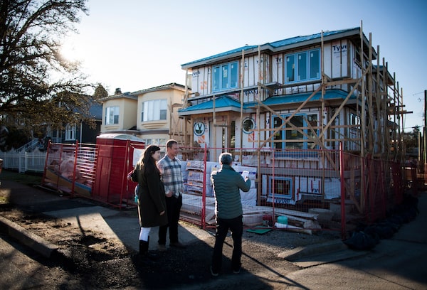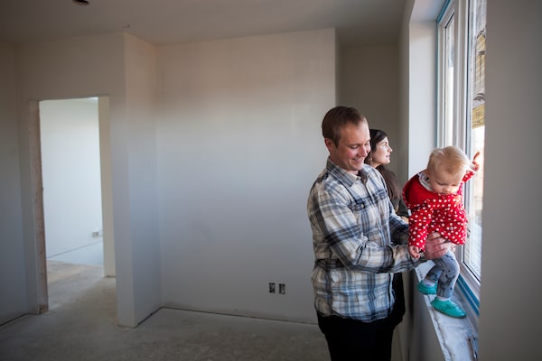 Patrick Baldwin, left, his wife Sarah and their one-year-old daughter Paisley speak to a contractor while visiting their under-construction home in Vancouver on March 11, 2018.Rafal Gerszak/Globe and Mail