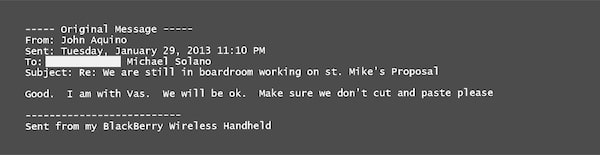E-mails recovered by Zurich show Mr. Aquino took comfort that Mr. Georgiou was in place for the RFQ.