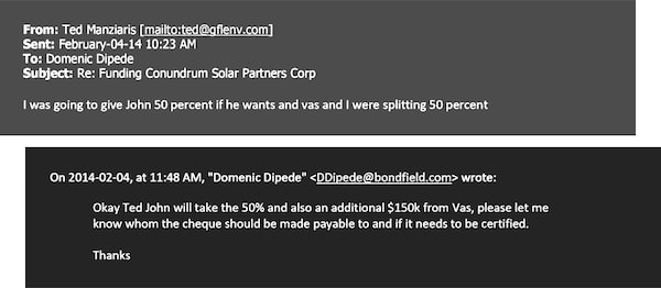 In 2014 – in the middle of the St. Michael’s procurement – Bondfield’s then controller, Domenic Dipede, exchanged e-mails with another Potentia shareholder, Ted Manziaris, about Mr. Aquino and Mr. Georgiou investing.