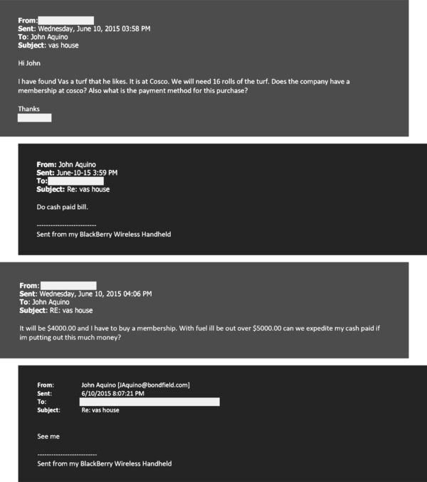 In April, 2012, about seven months before Mr. Georgiou started negotiations to join St. Michael’s, Mr. Aquino e-mailed one of his subordinates: “Call vas. We need to finish a few things at his place.” Other e-mails from 2013, 2014 and 2015 show Bondfield staff asked Mr. Aquino for instructions about how to record work done at “Vas house” or “Vas’s house.”