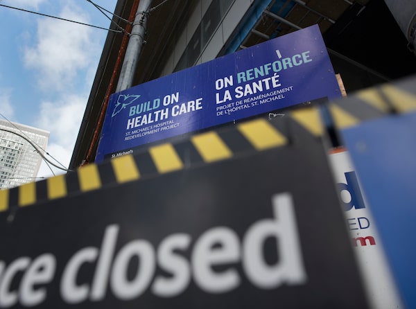 Infrastructure Ontario signs hang on the construction hoarding outside St. Michael's in 2018.Fred Lum/The Globe and Mail