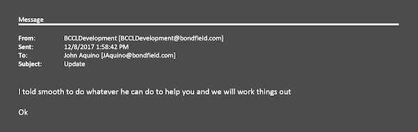On Dec. 18, 2012, Bondfield’s John Aquino, one of the company’s owners, received an e-mail from a colleague, “vas is in!”