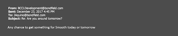 In December, 2017, there were several e-mails about Mr. Mendonca. On Dec. 8, Mr. Georgiou e-mailed Mr. Aquino: “I told smooth to do whatever he can do to help you and we will work things out.” Then, two days before Christmas, Mr. Georgiou e-mailed Mr. Aquino with a cryptic request: “Any chance to get something for Smooth today or tomorrow?”