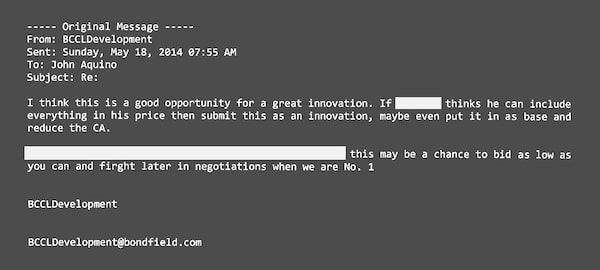 After the bids were submitted, the details of each were supposed to be confidential. Yet, on May 30, just nine days after submitting his bid, Mr. Aquino e-mailed his brother and father to let them know Bondfield had the lowest price: “We are low on St. Mikes.”