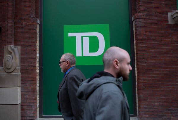 Pedestrians on Front St. West walking past the green TD logo outside a future bank branch in Toronto’s Financial District on Mar 4, 2024.Fred Lum/The Globe and Mail