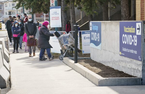 People wait in line to enter a COVID-19 test clinic next to a COVID-19 vaccination clinic in Montreal, on April 7, 2021.Paul Chiasson/The Canadian Press