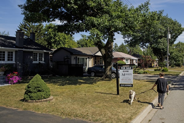 A For Sale sign sits on the front of a house in Oakville, Ontario on Aug. 15. Rising interest rates have made it difficult for borrowers to qualify for a large enough mortgage to purchase a property in the Toronto region.Cole Burston/The Globe and Mail