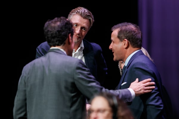 Paul Rivett, left, and Jordan Bitove, right, co-proprietors of the Toronto Star, meet on stage after a panel discussion on journalism and its correlation to democracy in Canada, in Toronto, on Nov. 17.Cole Burston/The Globe and Mail