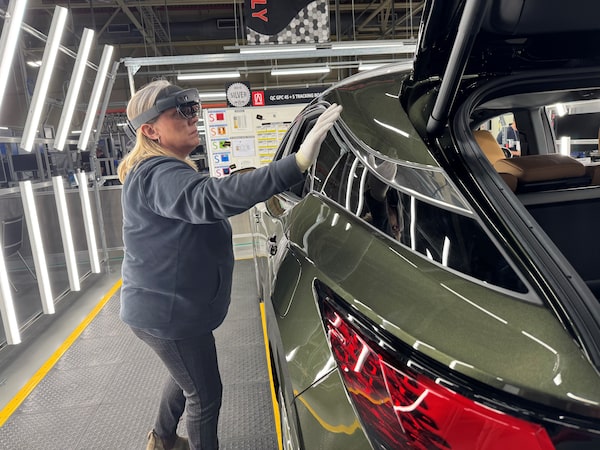 Unpainted SUVs roll down the assembly line as an autonomous train streams past ferrying bumpers. Nearby, white robotic arms flex and spark, welding body panels while a man in another part of Toyota’s TM-N north plant in Cambridge, Ont., runs gloved hands over car tops in search of burrs and imperfections.