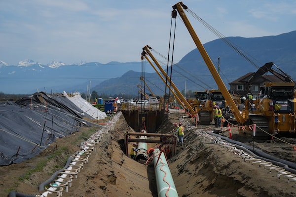 Workers lay pipe during construction of the Trans Mountain pipeline expansion on farmland in Abbotsford, B.C., on May 3.DARRYL DYCK/The Canadian Press