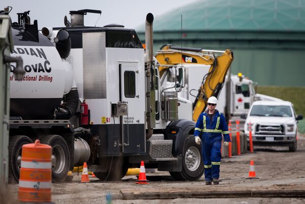 A worker walks past heavy equipment as work continues at Kinder Morgan's facility in preparation for the expansion of the Trans Mountain Pipeline, in Burnaby, B.C., on April 9, 2018. The Houston-based company announced on Sunday that it has suspended all non-essential activities and related spending on the pipeline expansion that would carry Alberta bitumen to an export terminal near Vancouver.DARRYL DYCK/The Canadian Press