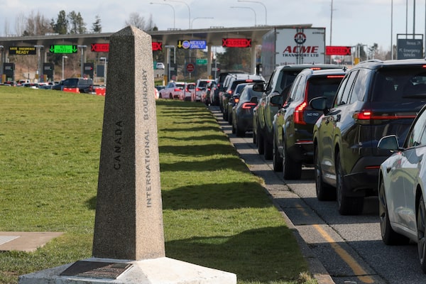 An international border marker is pictured as vehicles line up to enter the United States from Canada at the Peace Arch crossing in Blaine, Wash., on March 5.JASON REDMOND/AFP/Getty Images