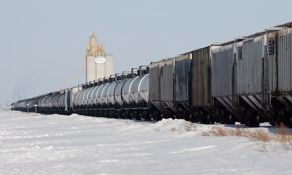 Grain and oil rail cars pass by a grain elevator in Rosser, Mb., which is just outside Winnipeg, in March, 2014.JOHN WOODS/The Canadian Press