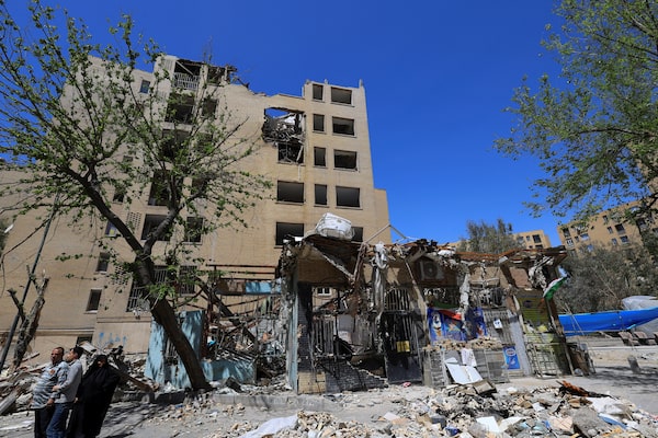 People stand in front of a residential building damaged by a strike on March 4, in Tehran on Tuesday.Thaier Al-Sudani/Reuters